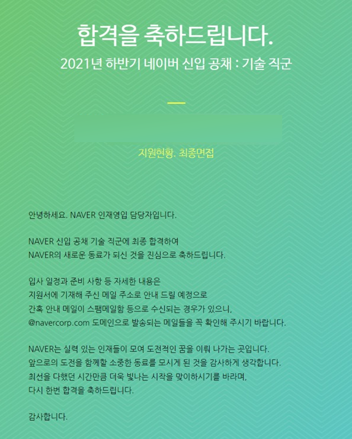 결과 : 2차 면접 통과해서 최종합격 통보받았습니다. 예전부터 2-3년 간 컴퓨터에 관심을 두고 있었으나 간단히 파이썬이나 다루며 코드 리딩이 가능한 수준이었고 본격적인 "개발자"로 직군을 전환하기 위한 준비는 대략 1년 3개월 정도 했습니다. 여러 기업에 동시에 지원서를 걸어두고 전형을 진행하느라 최종적으로는 1년 반만에 결과가 나왔습니다. 그래도 면접관으로 들어오신 분들이 저를 좋게 봐주셔서 그런지 예상보다 빠르게 자리를 잡을 수 있게 되었습니다. 남들보다 경험도 없고 전공지식도 얕은 편이라 계속 키워드를 찾으며 공부를 이어나가려 합니다.